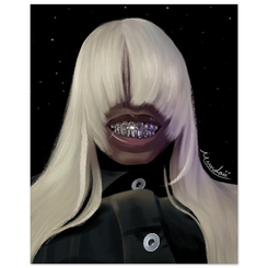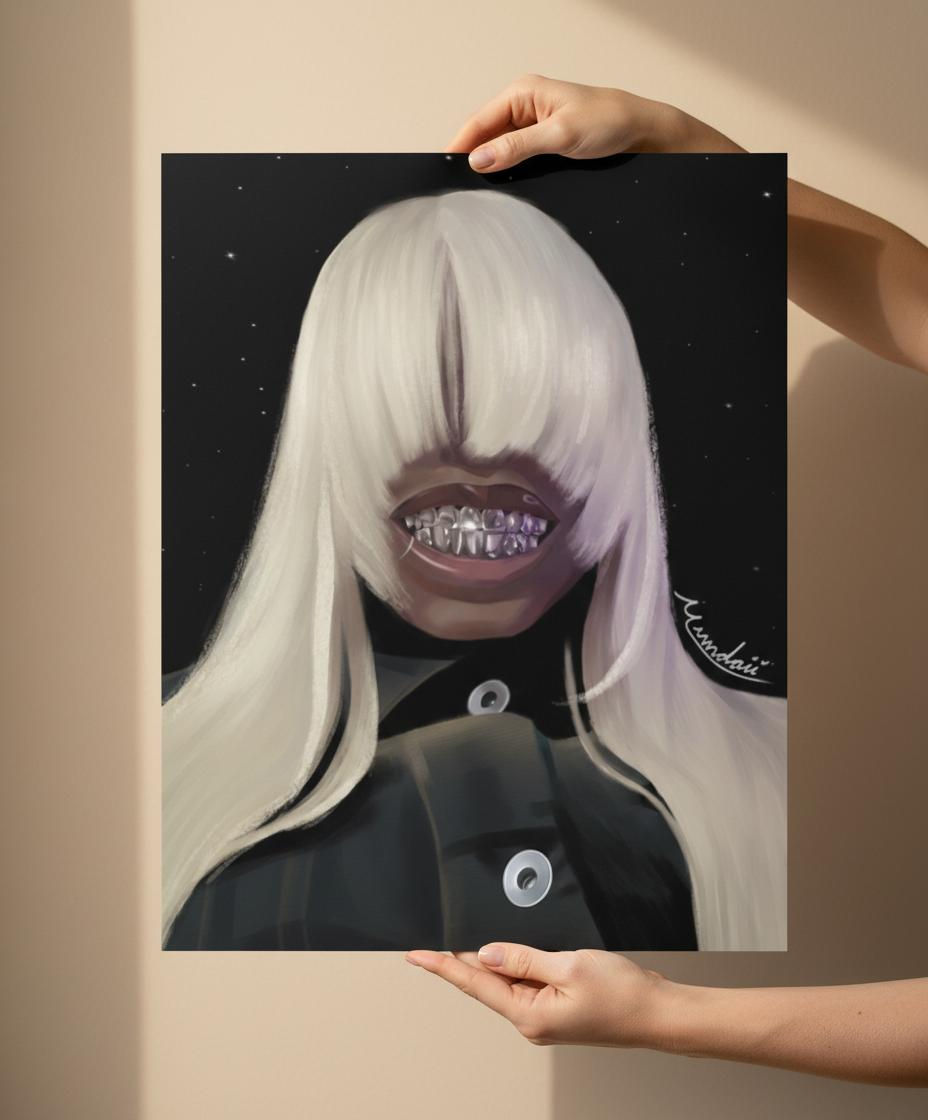 Femme Eclipse is a striking digital portrait that plays with mystery, femininity, and presence. The subject’s face is partially concealed by cascading platinum hair, drawing attention to the metallic grin beneath - a symbol of confidence, duality, and quiet power. Set against a deep, star-like backdrop, the piece balances softness and edge, light and shadow, creating an aura that feels both celestial and grounded. Designed to command attention without overpowering a space, this poster adds bold, contemporary energy to any room while inviting viewers to look more closely and sit with its mood.